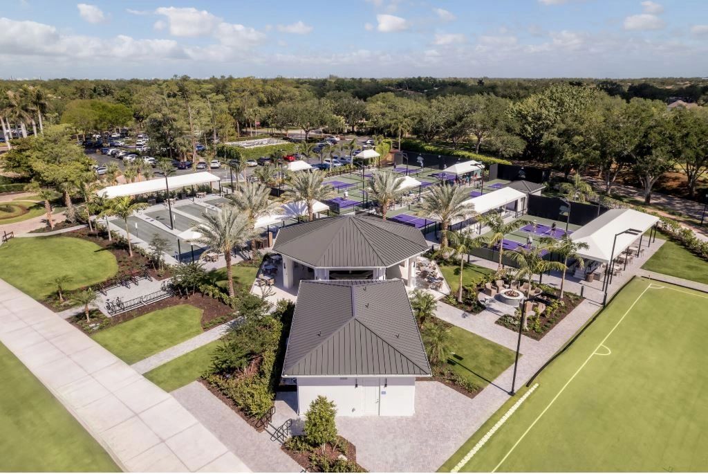 The new Activity Center includes pickleball and bocce courts, a croquet pitch, stadium seating under viewing structures, an outdoor bar, and a fire pit for gathering and sharing sports enthusiasm with friends.